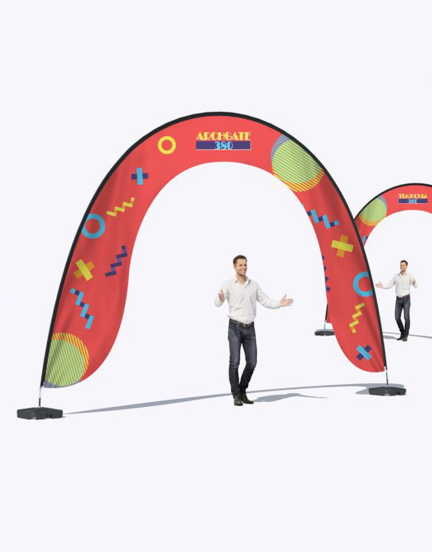 Arche d’entrée publicitaire personnalisée de longueur 5.50m par 3.40m de haut. Structure composée de mâts en fibre de carbone qui s’assemblent les uns dans les autres. La voile s’insère dans le mât comme un beach flag puis on fixe le mât sur les pieds. Impression recto sur maille bloquée polyester 115g/m², visible au verso par transparence. Fourreau noir en Oxford 300D. La structure se monte comme un oriflamme et se fixe aux mêmes pieds (en option) que les oriflammes classiques. Arche parfaite pour identifier un espace de vente. Utilisation intérieure ou extérieure.