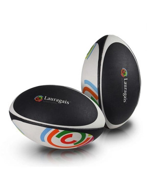 Ballon de rugby taille 5 officielle 100% personnalisé en caoutchouc vulcanisé à picots. Revêtement extérieur antiglisse. Cousu machine 4 panneaux. Vessie latex synthéthique. Personnalisation intégrale en sérigraphie (6 couleurs maximum)