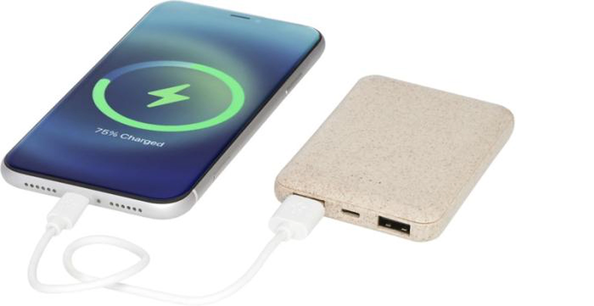 Batterie de secours compacte et légère de 5 000 mAh fabriquée dans un mélange de paille de blé et de matériaux plastiques, ce qui réduit la quantité de plastique nécessaire. Double sortie USB permettant de charger 2 appareils en même temps. Emballé dans une boîte cadeau et livré avec un manuel (fait à partir de matière durable). Câble de charge Micro USB inclus.