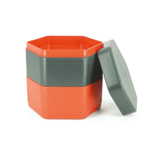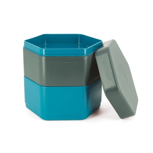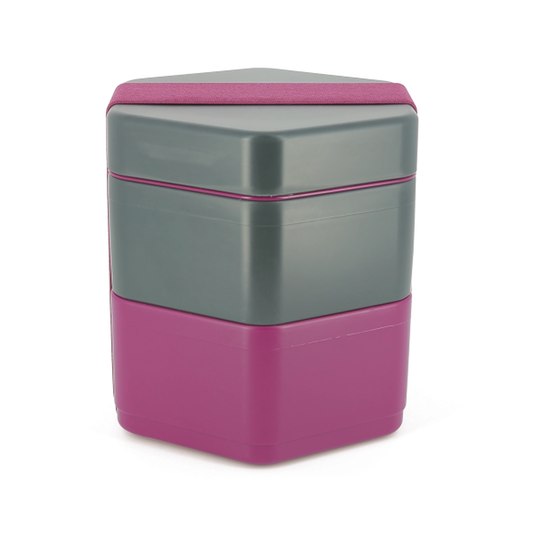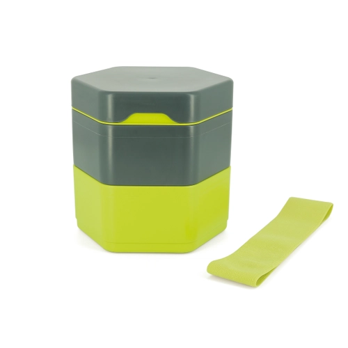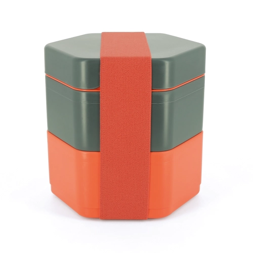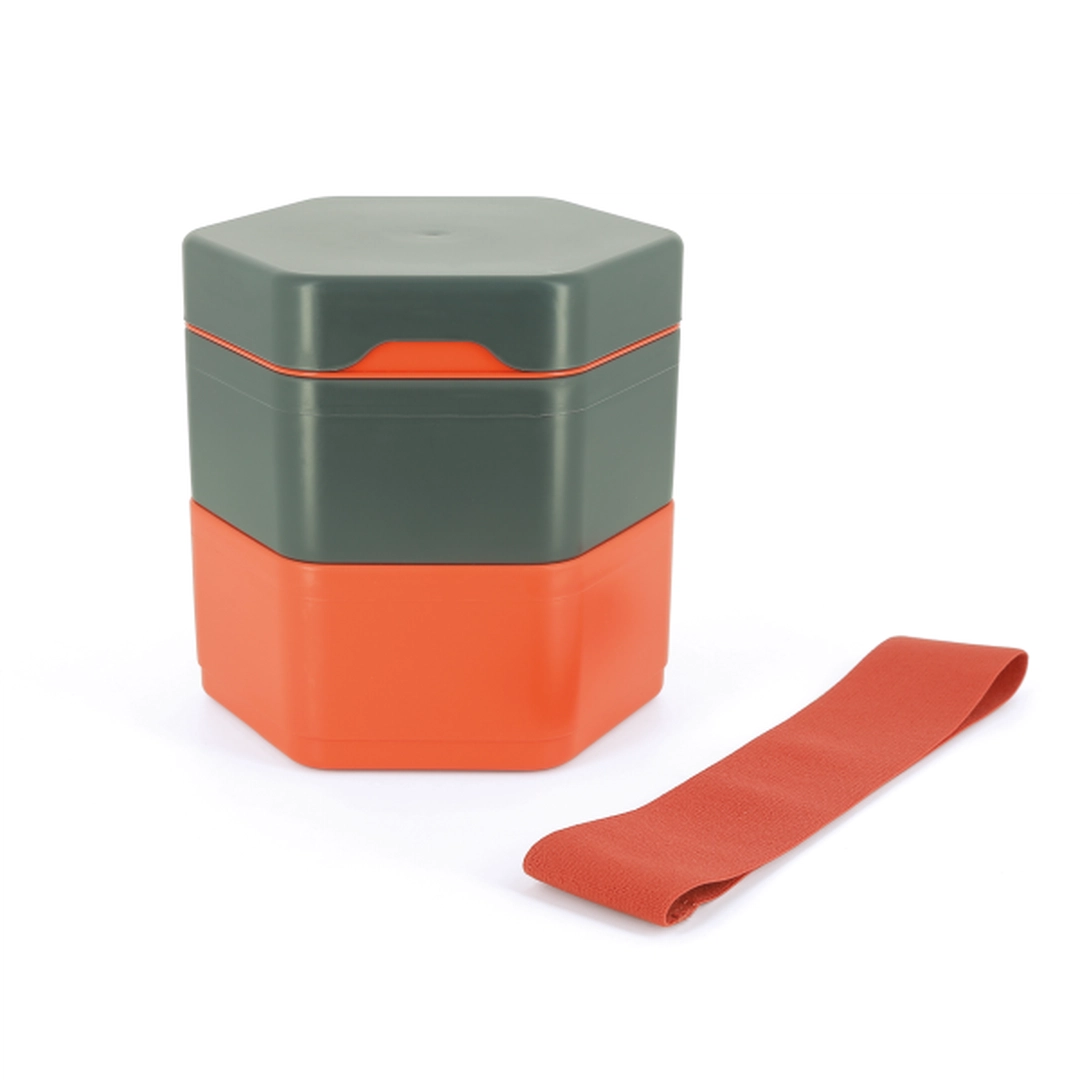 Bento à partir de fibres de canne à sucre. Composé de 2 parties de 500 ml, 1 compartiment couleur de 200 ml inséré à l'intérieur du compartimen gris. Fermée par un élastique.