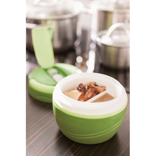 Boîte isotherme JOKO : intérieur amovible (utilisable au micro-ondes) avec 2 compartiments, poignée intégrée au couvercle vissable, compartiment avec fourchette-cuillère pliable. La boîte tient au chaud/ froid jusqu´à 4 heures, contenu env. 450 ml.
