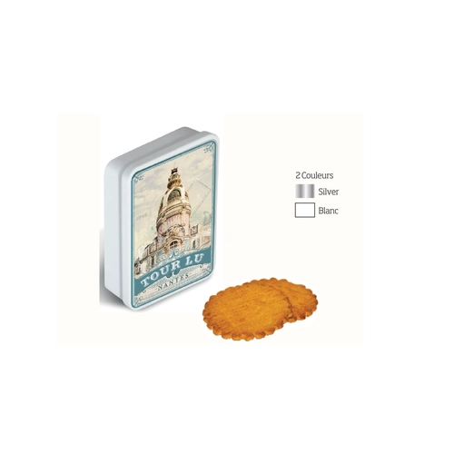Support marketing plébiscité par les marques dès le début des années 1900, les boîtes en métal restent de parfaits outils de communication pour promouvoir votre entreprise. Disponibles en gris métallisé ou blanc, ces boîtes plates en fer garnies de grands sablés sont personnalisables sur leur couvercle. Pour maximiser votre visibilité, optez pour un visuel représentant votre entreprise ou un logo à afficher fièrement sur cette boîte publicitaire. Soyez-en sûr(e), vos clients et collaborateurs se feront un plaisir de conserver cette boîte, après avoir dégusté les sablés, pour la réutiliser comme boîte à gâteau ou à sucre. De quoi promouvoir votre marque, à long terme, et fidéliser votre cible.