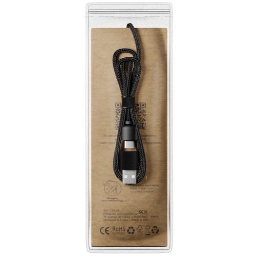 Le câble est constitué de matériaux écologiques : bois certifié FSC et cordons issus de bouteilles recyclées (rPET).