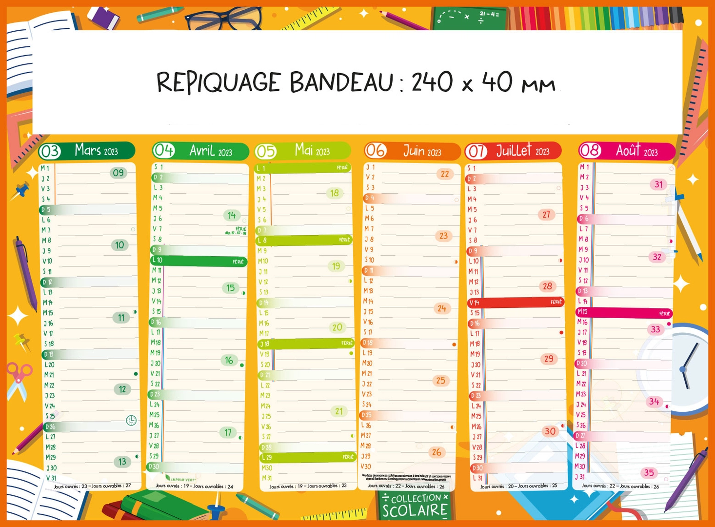 Calendrier bancaire 2025 SCOLAIRE - format 27 x 21 cm - 6 mois par face