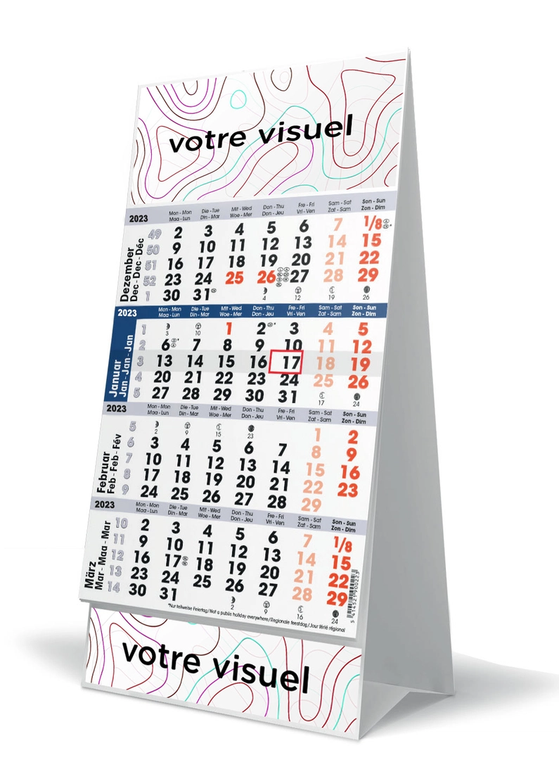 - Verso : espace personnalisable de 105 x 210 mm. Si pas de personnalisation au verso, impression du calendrier annuel.