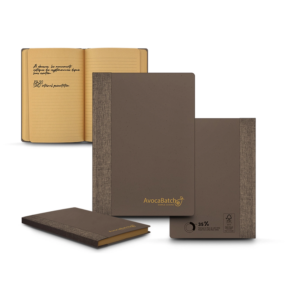 Que vous soyez un passionné de café ou simplement en quête d'un produit unique et durable, le carnet A5 de Pantacom ne manquera pas de vous séduire. Ce bloc-note, à la fois discret et pratique, est conçu pour accompagner tous vos déplacements. Grâce à sa démarche éco-responsable, sa couverture intègre 35% de fibres de café, offrant une texture et un parfum subtils qui raviront les sens de chaque utilisateur.