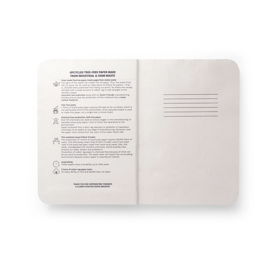 Le papier intérieur du bloc-notes, confectionné avec 35% de déchets de coton, est reconnu pour sa résistance et sa durabilité. Avec 100 pages lignées, accompagnées d'une bande de papier ornée d'un dessin, ce bloc-notes est idéal pour la prise de notes, les journaux intimes, ou comme carnet de croquis.
