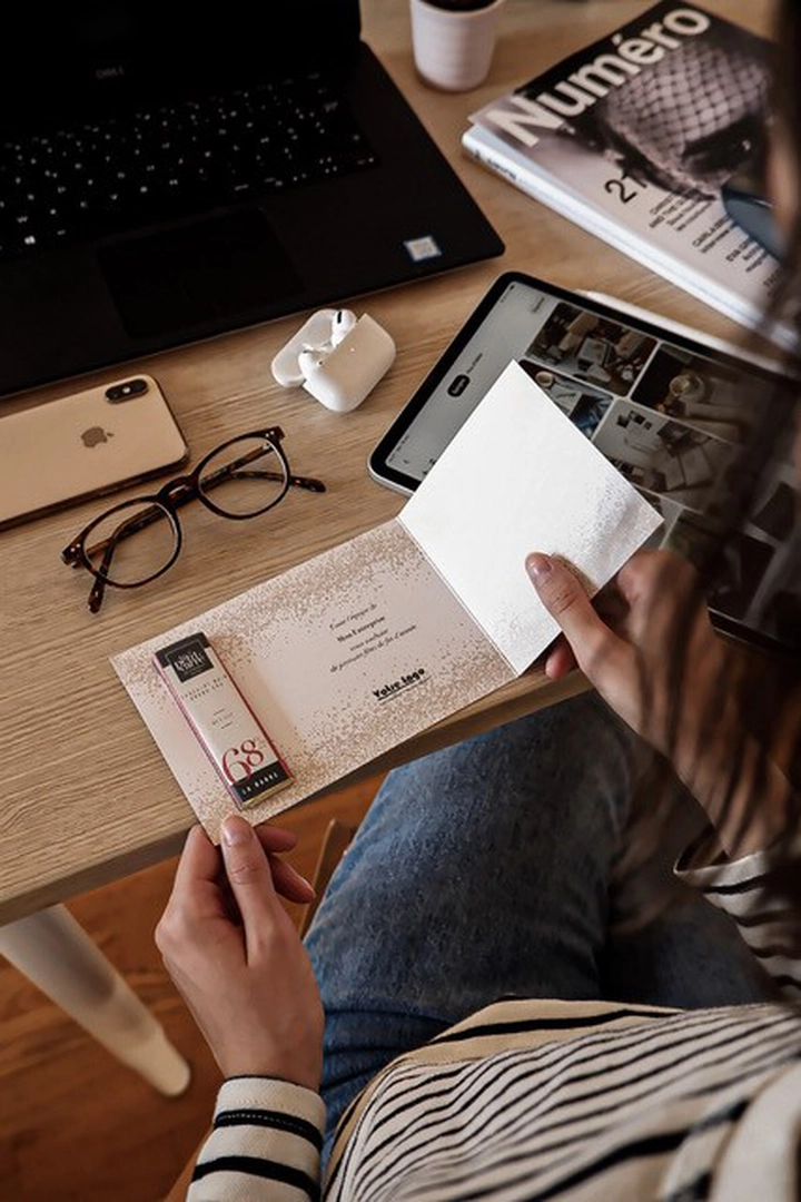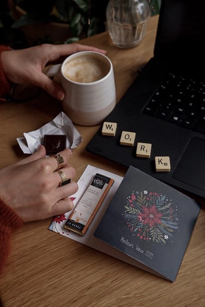 Offrez pour les fêtes de fin d'année une carte de voeux personnalisée à vos collaborateurs, clients ou autres partenaires ! Le chocolat, qui compose la carte, est confectionné par un Maître artisan depuis 2012 au sein d'une société familiale et qui souhaite que le chocolat soit enfin accessible à tous ! Le chocolat fabriqué est le résultat de la confection de recettes uniques à partir de chocolats grands crus et de qualité, aux arômes uniques et inoubliables !