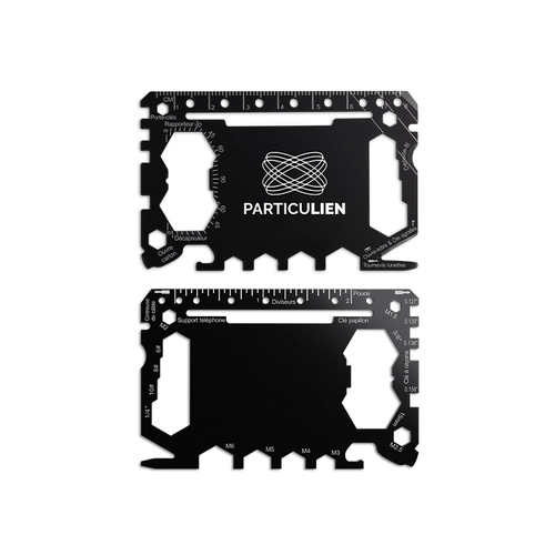 Offrez un outil aussi compact qu’ingénieux avec cette carte multifonction personnalisable en acier inoxydable. De la taille d’une carte de crédit, elle tient dans un portefeuille et offre 46 fonctions utiles pour les petits dépannages du quotidien.