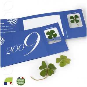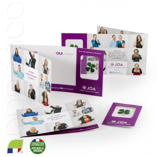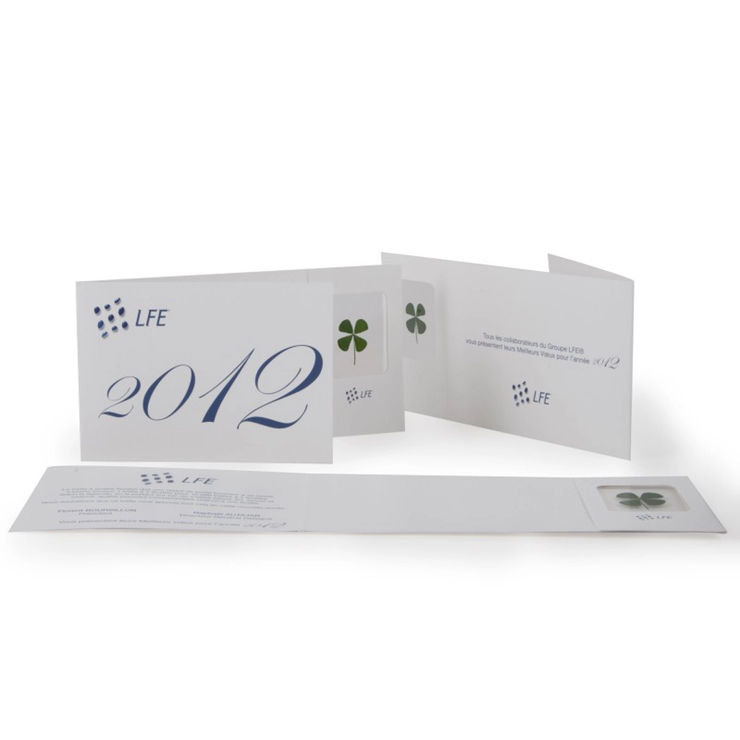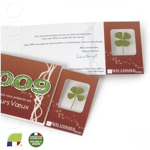 Du bonheur à offrir en carte personnalisée à votre nom ! Envie d'envoyer du positif ? Voici une carte entièrement imprimée à votre communication sur toute la surface visible. Un trèfle à 4 feuilles est inséré à l'intérieur pour véhiculer un message optimiste de chance, de bonheur et de prospérité. Un grand choix de modèle pour s'adapter à votre mailing (ou autre mode de distribution), à votre budget, à votre message etc.