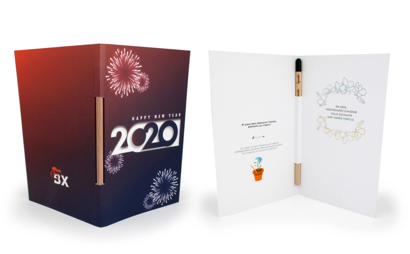 Le crayon à graines est présenté dans une carte prestige pour une présentation soignée et élégante.