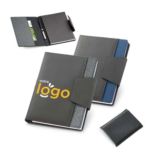 Le conférencier A5 publicitaire est un porte-documents personnalisé généralement équipé de blocs-notes, stylos, pochettes… Ce modèle est équipé d’une fermeture aimantée, d’un bloc-notes de 160 pages non lignées, d’une poche intérieure et d’un porte-stylo bille (non inclus). Sa couverture rigide en simili cuir et tissu polyester assure un objet publicitaire robuste. Le conférencier publicitaire pourra être glissé dans un sac sans s’abimer.
