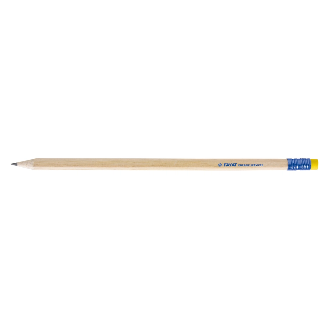 La forme de ce crayon est Ronde, mais nous proposons également ce crayon en format Hexagonal. Nous vous proposons ce crayon publicitaire sans vernis. Vous remarquerez également que le crayon a une tête avec gomme. Pour cela, vous avez le choix entre 15 couleurs de virole et 25 couleurs de gomme, vous permettant d'avoir un pantone approchant de votre logo d'entreprise. Sachez également que le crayon existe sans gomme. (tête coupée).