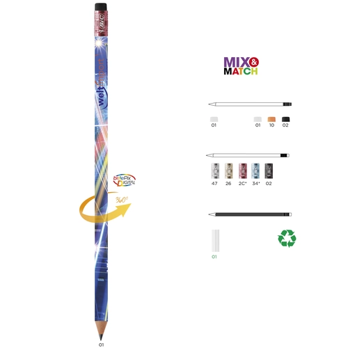 - Marquage par la sérigraphie, jusqu’à deux couleurs, sur le corps du Crayon avec sa gomme 100% recyclable, de 20 x 60 mm de dimension.