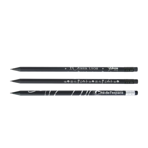La forme de ce crayon est ronde mais existe en format Hexagonal ou carré. Nous vous proposons ce crayon publicitaire avec vernis noir teinté dans la masse. Il existe également avec vernis incolore ou sans vernis. Vous remarquerez également que le crayon a une tête avec gomme mais existe également avec tête pastillé ou tête coupée (sans gomme). Pour ce crayon avec gomme, vous avez le choix entre 15 couleurs de virole et 25 couleurs de gomme, vous permettant d'avoir un pantone approchant de votre logo d'entreprise.