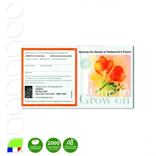 Nous vous laissons choisir vos mariages de graines dans notre collection d'aromates, de fleurs, de légumes et de graines d'arbres. Le Duo de sachet de graines est personnalisable en impression quadrichromie à votre communication.