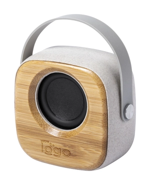 Enceinte Bluetooth en bambou et boîtier plastique écologique en paille de blé, avec batterie rechargeable intégrée. Câble chargeur USB inclus.