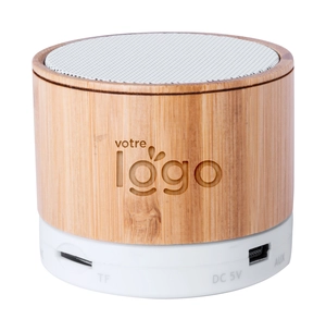 Enceinte Bluetooth dans un boîtier en bambou. Fonction appel mains libres, radio FM et batterie rechargeable intégrée. Livrée avec câble chargeur USB.