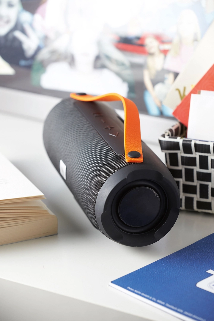Haut-parleur sans fil MEGA BOOM : sortie 2 x 5 watts, à connecter avec un téléphone portable, une tablette, etc., peut être connecté à des périphériques externes via le câble AUX-IN, lecture de fichiers MP3 via USB et carte Micro-SD, fonction mains libres, avec radio FM, puissante batterie rechargeable, capacité: 1 200 mAh, autonomie: env. 2-3 h, temps de charge: env. 2 h, distance max. env. 10 m, incl. câble de charge USB avec connecteur micro-USB (longueur: environ 34,5 cm) et câble audio (longueur: environ 51 cm), incl. petite plaque de gravure, manche en silicone orange.