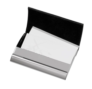 Étui cartes de visite PIET : intérieur en tissu doux au toucher, extérieur brillant et en alliage zinc et couvercle en optique cuir véritable avec coutures, avec fermeture aimantée sûre.