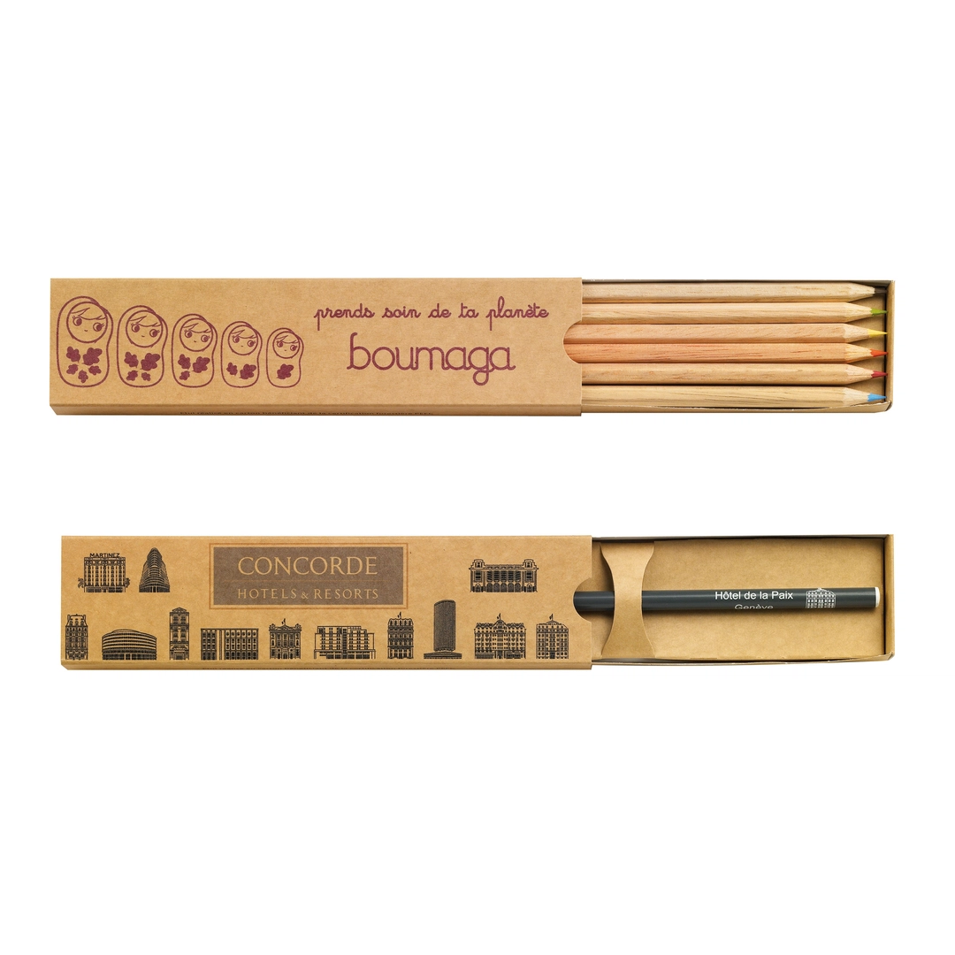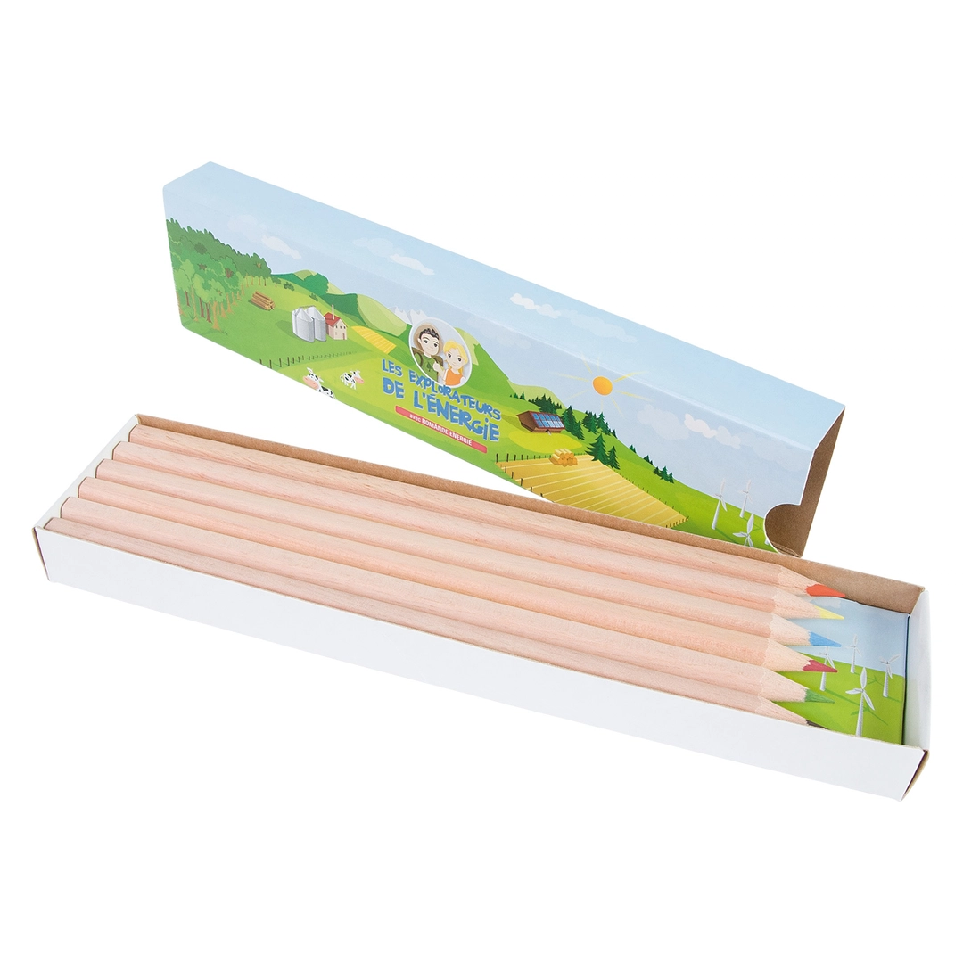 Un set de crayons de couleurs personnalisable est un ensemble de crayons de couleurs pour dessiner pendant vos moments de détente. Cette petite boite à crayons personnalisée contient 12 crayons de couleurs non marqués. Sa dimension de 17.6 cm est le format idéal pour des crayons de couleurs pour une durée de vie plus longue. Selon votre budget, vos besoins et vos envies, vous pouvez également opter pour un kit personnalisable de crayons miniatures. Le petit format est plus pratique à transporter mais moins durable dans le temps.