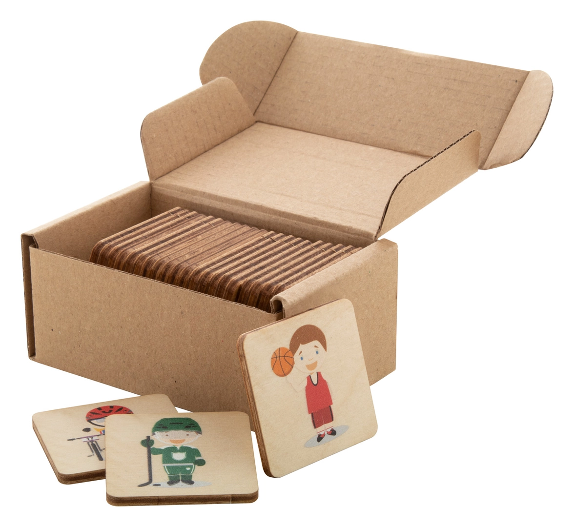 Jeu de memory en bois de bouleau laminé avec des motifs thématiques.
