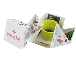 Ce cadeau publicitaire écoresponsable est parfait pour faire pousser fleurs, aromates ou légumes au fil des saisons, grâce à un roulement simple et pratique des semis. La grande surface de marquage sur la boîte en papier 350 g/m² permet de valoriser pleinement votre identité visuelle.