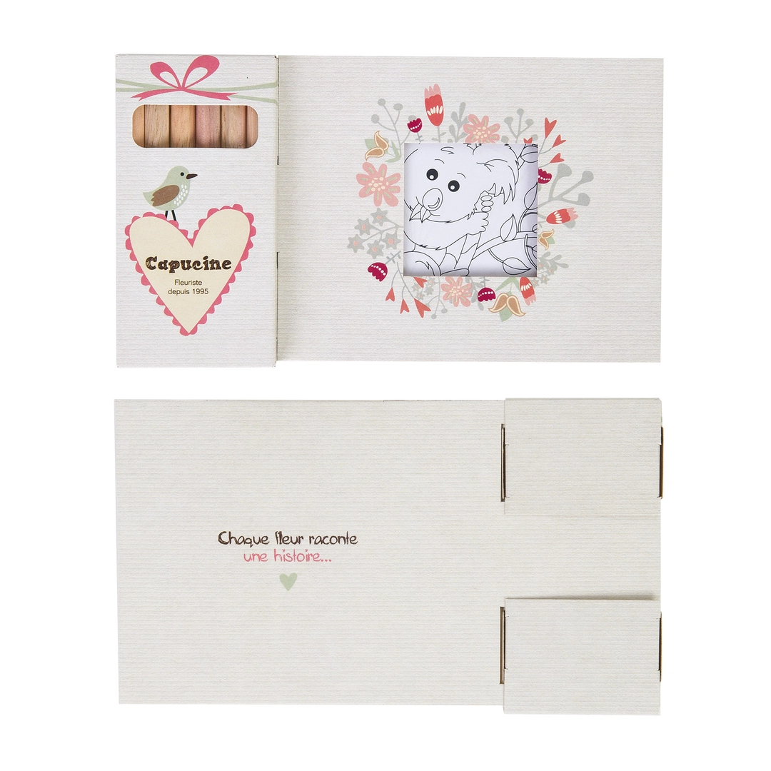 Un set de crayons de couleurs personnalisable, est un ensemble de crayons de couleurs pour dessiner pendant vos moments de détente. Dans ce kit de coloriage 6 crayons, vous pourrez découvrir 12 coloriages différents. À partir de 500 exemplaires, vous pourrez même choisir le thème de vos coloriages (mandalas, animaux …). Le format des crayons est pratique pour les emporter partout.
