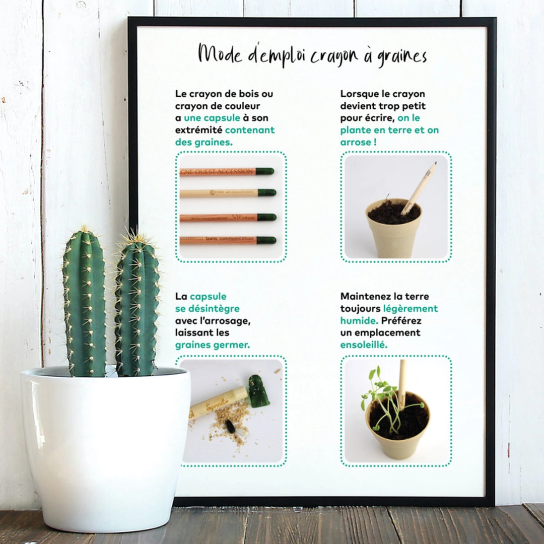 Le crayon à graines contient une capsule de graines à son extrémité, après usage, quand le crayon devient trop court, il suffit de planter le crayon dans le pot avec la tourbe préalablement arrosée et on a la surprise de voir germer la plante choisie parmi les variétés : Basilic, Sauge, Tournesol, Tomate cerise, Myosotis, Thym, Marguerite, Epicéa