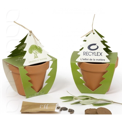 Le Kit de plantation personnalisé "replantons un arbre" est personnalisable sur le fourreau découpé en forme d'arbre est imprimé en quadrichromie.