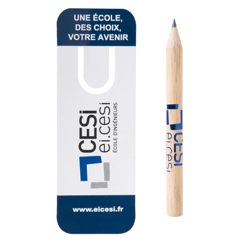 Ce kit personnalisable est parfait pour tout secteur d’activité. La surface de marquage du marque-page est large, ce qui vous permet d’y apposer un visuel, votre logo ou votre slogan de manière qu’il soit visible. Le crayon de bois publicitaire quant à lui est un objet utile au quotidien et permettra à vos cibles d’écrire en pensant à vous.