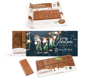 Aider n’a jamais été aussi facile ! Avec le chocolat de Plant-for-the-Planet, vous pouvez faire quelque chose de bien, petit à petit. Pour chaque lot de 5 tablettes, un arbre est planté pour lutter contre l’effet de serre. Délicieux chocolat au lait Suisse dans un étui personnalisable.
