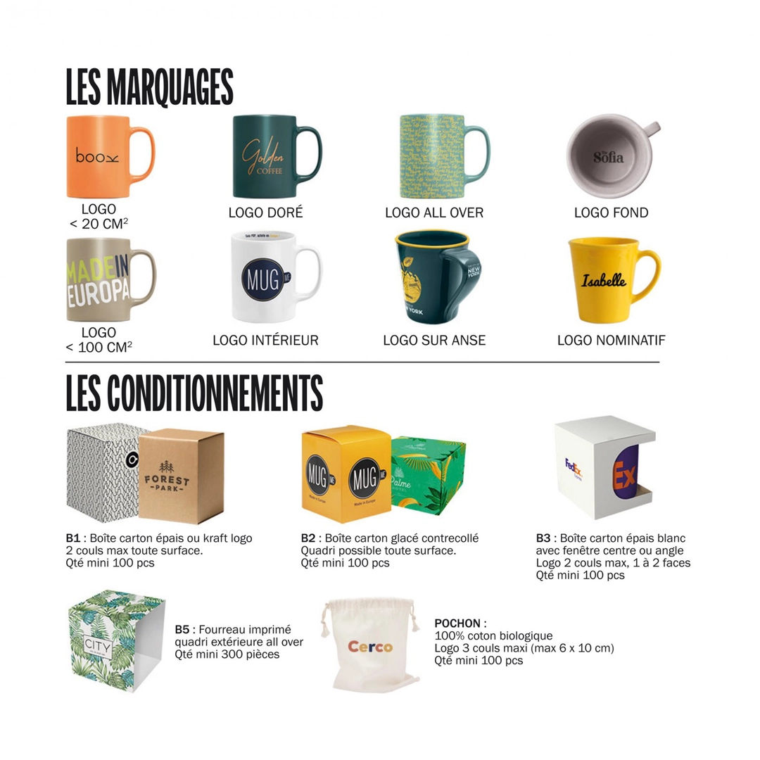 Son marquage est réalisé par transfert sérigraphique vitrifié, assurant une personnalisation résistante dans le temps, même après lavage. Plusieurs glaçures sont disponibles pour s’adapter à votre univers graphique.