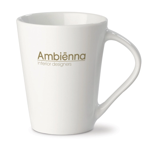 Mug blanc en porcelaine de haute qualité. La version originale du Nice. Made in Europe. Modèle conique avec grande surface de marquage.