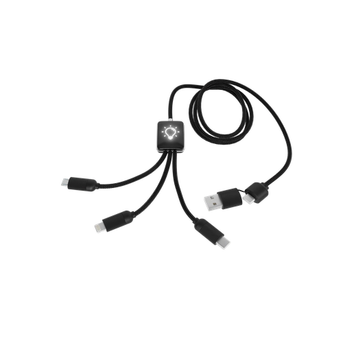 Câble d'un mètre avec double logo lumineux recto/verso pour type C, iPhone et Android et cordons en rPET (plastique issus de bouteilles recyclées).