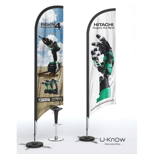 Beach flag classique en forme d'aile d'avion ou plume de 3,50m de hauteur. Voile oriflamme en matière 100% polyester 115g/m² de taille 279(h)x70(l)cm. En impression recto seul, le visuel est visible sur l'autre côté par transparence. En impression numérique, il est possible d'imprimer en recto/verso ; une feuille occultante insérée entre les deux côtés permet d'avoir une meilleure lisibilité. Le fourreau noir de la voile est renforcé et fabriqué dans un polyester Oxford 300 D. Le mât est en fibre de carbone (très résistant). Les mâts se fixent sur tous les pieds de la même manière. L'axe de rotation présent sur les pieds pivote à 360°. Les voiles se tendent sur tous les mâts grâce à un élastique. Utilisation intérieure et extérieure. Garanti pour un vent inférieur à 70 km/h.