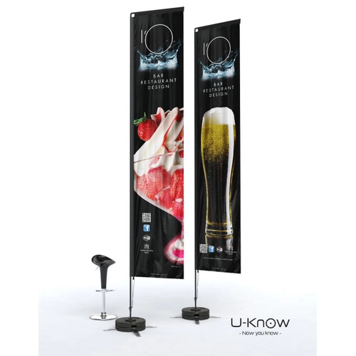Beach flag en H ou rectangulaire de 4,2m de hauteur. Voile oriflamme en matière 100% polyester 115g/m² de dimensions 70(l)x350(h)cm.  En impression recto seul, le visuel est visible sur l'autre côté par transparence. En impression numérique, il est possible d'imprimer en recto/verso ; une feuille occultante insérée entre les deux côtés permet d'avoir une meilleure lisibilité. Le fourreau noir de la voile est renforcé et fabriqué dans un polyester Oxford 300 D. Le mât est en fibre de carbone (très résistant). Les mâts se fixent sur tous les pieds de la même manière. L'axe de rotation présent sur les pieds pivote à 360°. Les voiles se tendent sur tous les mâts grâce à un élastique. Utilisation intérieure et extérieure. Garanti pour un vent inférieur à 70 km/h.