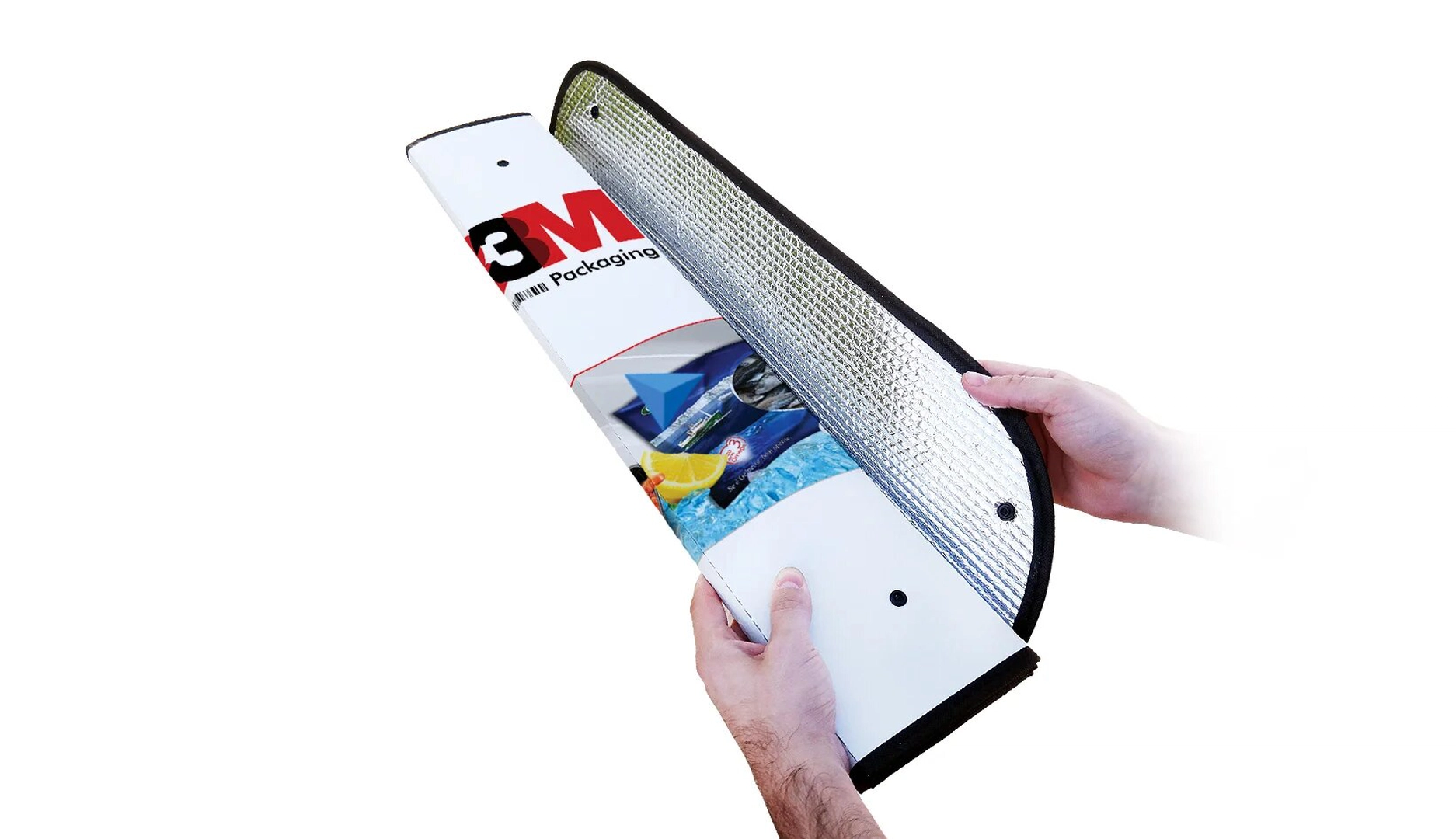 Le Pare-soleil personnalisé FOLD est fabriqué en Europe, au Portugal ! Ce pare-soleil est réalisé en matériaux recyclés, plus exactement en PET bulle d’Air polyéthylène aluminisé.