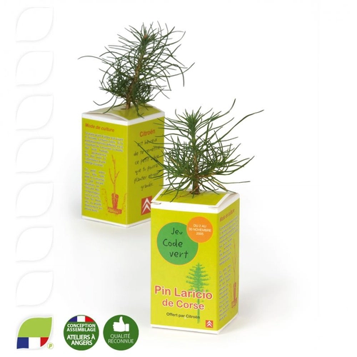 Plant de pin en cube carton imprimé. Cadeau green et personnalisé à offrir à vos prospects et clients pour une communication développement durable. Il s'agit d'un cadeau personnalisé à votre communication. Le pin reste le petit arbre le moins cher et le plus abordable de la gamme.