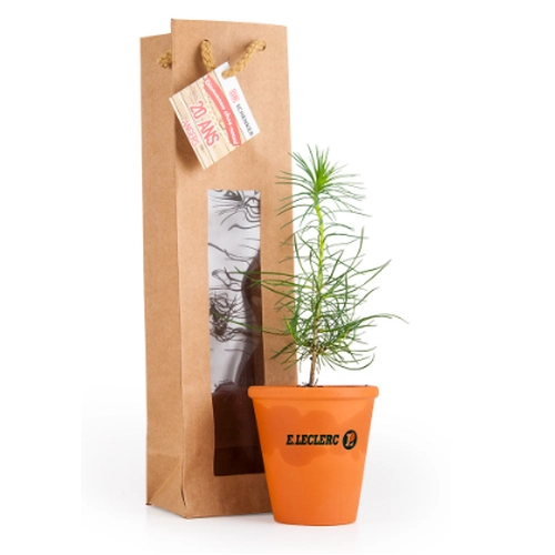 Plant de pin en pot terre cuite et sac kraft prestige brun. Cadeau green et personnalisé à offrir à vos prospects et clients pour une communication développement durable. Il s'agit d'un cadeau personnalisé à votre communication sur un mode de culture imprimé en quadri à votre communication. Il est aussi envisageable d'ajouter votre logo sur le pot de présentation. Le pin reste le petit arbre le moins cher et le plus abordable de la gamme et disponible toute l'année.