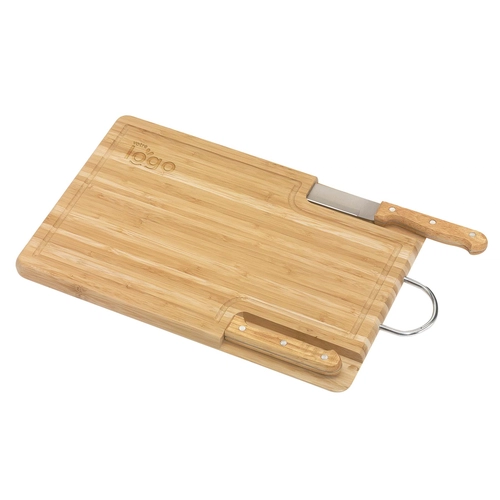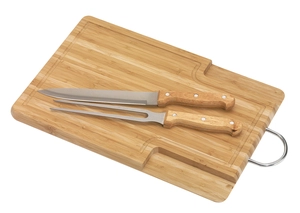 Planche à découper BAMBOO-CUT : incl. couverts à découper, couteau et fourchette en acier inoxydable avec manche en bois, 2 fentes intégrées pour rangement et bonne conservation des couverts, planche en bambou avec poignée métallique pour faciliter le rangement.