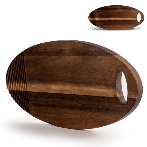Notre planche à découper en bois d'acacia certifié FSC ne manquera pas de vous étonner par sa forme originale et son design unique. Conçue pour être aussi pratique qu'élégante, cette planche ovale avec des bandes découpées à une extrémité, ne laisse personne indifférent. Sa robustesse, due au bois d'acacia foncé, s'associe à une esthétique soignée pour s'harmoniser parfaitement avec votre table et votre cuisine.
