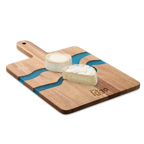 Planche de service en bois d'acacia avec détails incrustés en résine époxy et poignée. Le bois est un produit naturel, et présente de légères variations de couleur, de décoration et de tailles.
