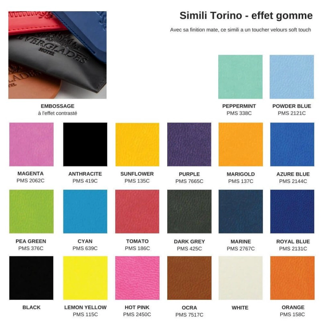 Simili Belluno ou Torino: Le simili Belluno a un aspect cuir véritable tandis que le simili Torino est effet gomme (soft touch). Ils sont tous les deux disponibles dans un large choix de coloris avec un débossage (marquage en creux) au changement de couleur unique, même sur les détails les plus fins.