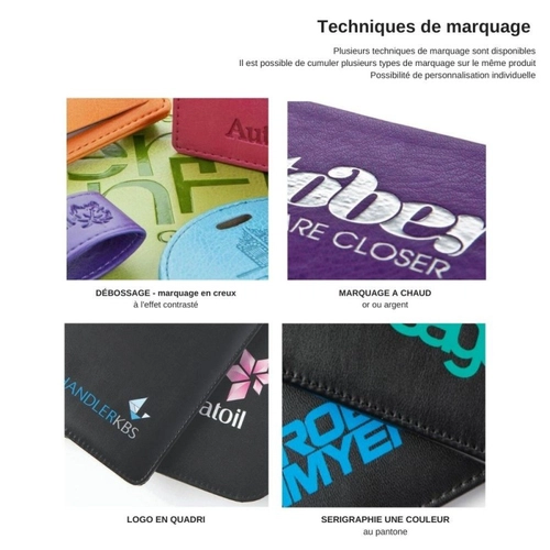 - Types de marquage: marquage en creux (débossage / embossage), marquage à chaud, impression 1 couleur, impression quadri all over, impression quadri