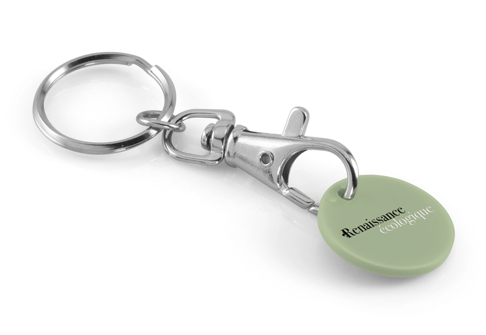 Sa matière en bio-plastique fait du porte clés jeton publicitaire avec jeton bio plastique le goodies écologique idéal.