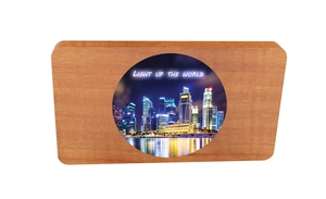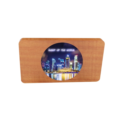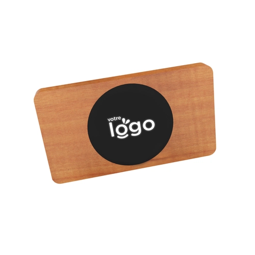 Batterie de secours lumineuse pensée dans le respect des normes environnementales : bois certifié FSC, câble 3-en-1 en rPET inclus, rubber avec revêtement antibactérien. Le logo lumineux se présente ici dans une forme ronde afin de réduire davatange la part de plastique dans le produit.