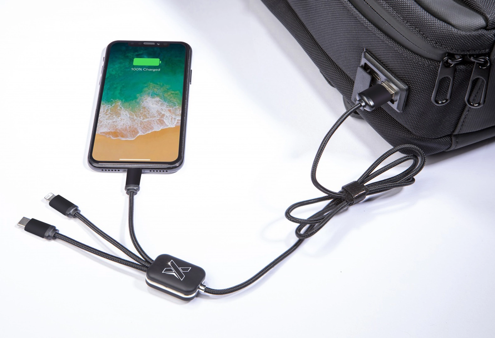 Equipé d'une batterie à charge rapide de 10.000 mAh, le sac à dos est également fourni avec un câble de chargement lumineux en rPET. Le câble permet de charger la batterie directement à partir du connecteur USB et Android à l'extérieur du sac (sans besoin de retirer la batterie).