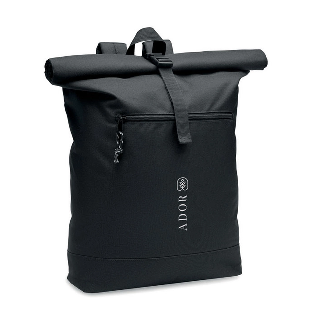 Sac à dos enroulable en polyester 600D RPET avec dos et fond rembourrés. Poche frontale zippée. La doublure est en RPET 210D.