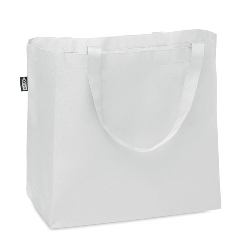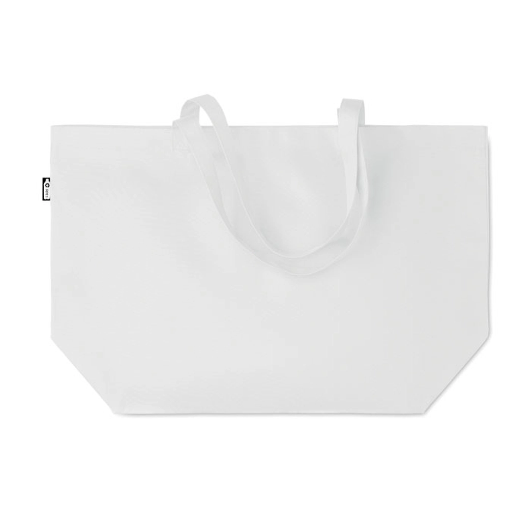 Grand sac shopping ou sac de plage en 600D RPET. Ce sac est idéal pour transporter vos courses quotidiennes ou lorsque vous devez transporter d'autres articles. Grâce à ses longues anses, il peut être tenu dans vos mains ou porté à l'épaule. Ce sac en PET recyclé possède un soufflet dans le fond, ce qui vous permet de transporter plus d'articles qu'un sac de forme normale.